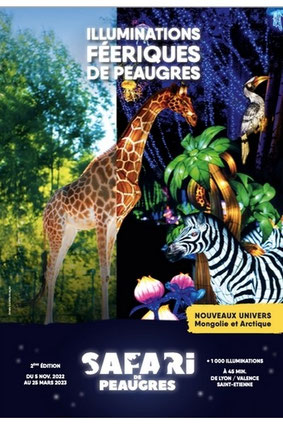 us visiterez, seul ou en famille, le parc voiture et le parc à pied. Le Wow Safari Peaugres, plus grand parc animalier d’Auvergne Rhône-Alpes, dans un cadre naturel exceptionnel de 80 hectares, vous invite à admirer 1300 animaux venus des cinq continents. À la suite de votre journée, vous profiterez du Festival des Lumières Sauvages. Plus de 2000 sculptures lumineuses (+ 500 par rapport à l’édition 2023/2024) sous forme d’animaux et de végétaux, réalisées entièrement à la main selon une tradition ancestrale chinoise. Alors venez nombreux partager ce moment féérique et convivial autour des animaux.